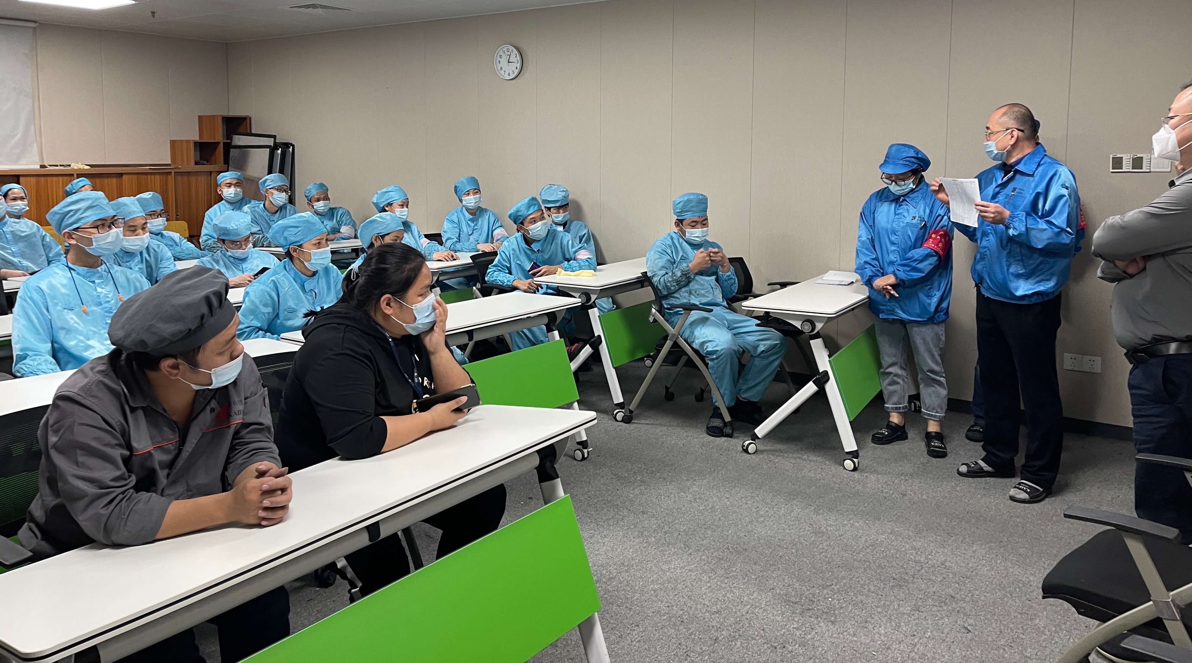 领导干部冲在前线。精密公司全力配合指挥部工作,总经理曾卫以身作则坐镇一线指挥,吃住都在园区,带领全体员工做好疫情防控及安全生产工作,率管理层下潜生产一线保产能。事业部总经理、BU负责人,工程、制造高级经理,工艺、设备经理,全部工程师、主管以及计划部员工、IQA、QMD、HR&A员工都放下手头的工作,穿上车间工作服,挺身而出站到产线各个普通岗位上。他们自带铺盖,吃住行均在工厂,与产线员工一起保生产、保产出。为了让产线员工有更好的休息环境,他们住在办公室,腾出宿舍供奋战在生产一线的员工。